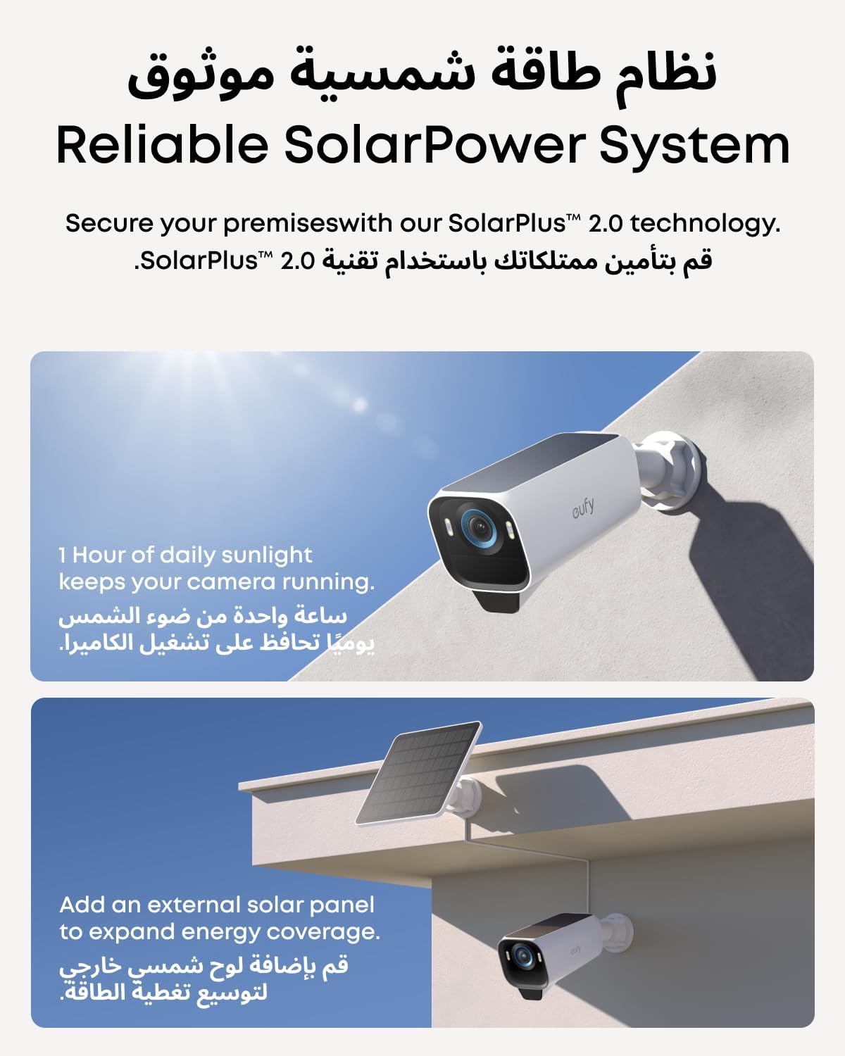 Reliable Solar Power System: Experience peace of mind year-round with continuous, reliable security powered by SolarPlus™ 2.0 technology. Choose the built-in panel for streamlined efficiency or add an external panel to expand energy coverage. This system offers versatile mounting options and reliable backup power for continuous security.(includes backup solar panel).